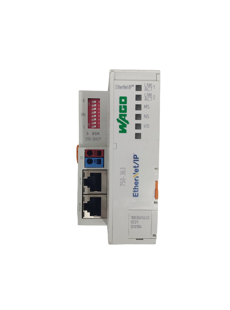 O acoplador de barramento de campo 750-363 EtherNet/IP conecta o sistema de barramento de campo EtherNet/IP ao modular I/O System da WAGO.